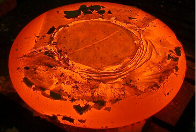 該油缸件重1300kg,直徑Φ586mm,內(nèi)徑Φ401mm,高1019mm,孔深732mm,材質(zhì)35CrMo,使用反擠壓的方式一次成型。相比傳統(tǒng)的自由鍛件,反擠壓件不僅可以大大提高材料利用率和產(chǎn)品的生產(chǎn)效率,而且可以保持產(chǎn)品內(nèi)部金屬流線的完整性,從而大大提高了產(chǎn)品的力學(xué)性能。