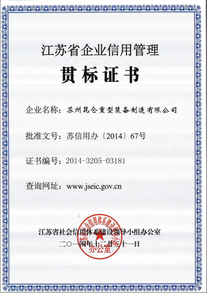 通過(guò)學(xué)習(xí)、貫徹《江蘇省企業(yè)信用管理規(guī)范》,經(jīng)申請(qǐng)、實(shí)施、驗(yàn)收三個(gè)階段,昆侖重工于2014年底順利通過(guò)“企業(yè)信用管理”貫標(biāo)驗(yàn)收,并于日前獲得由江蘇省社會(huì)信用體系建設(shè)小組領(lǐng)導(dǎo)辦公室頒發(fā)的“江蘇省企業(yè)信用管理貫標(biāo)證書(shū)”。