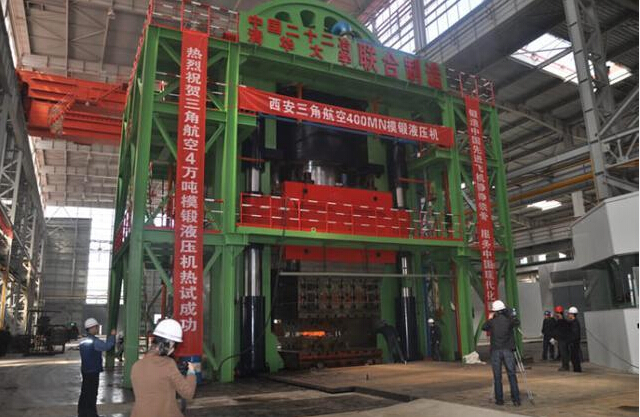 2012年3月3日,中國(guó)首臺(tái)40000噸級(jí)模鍛液壓機(jī),在西安閻良三角航空科技有限責(zé)任公司進(jìn)行熱試車(chē),并順利鍛造出了大型盤(pán)類(lèi)件產(chǎn)品。該機(jī)采用鋼絲纏繞預(yù)應(yīng)力結(jié)構(gòu)。