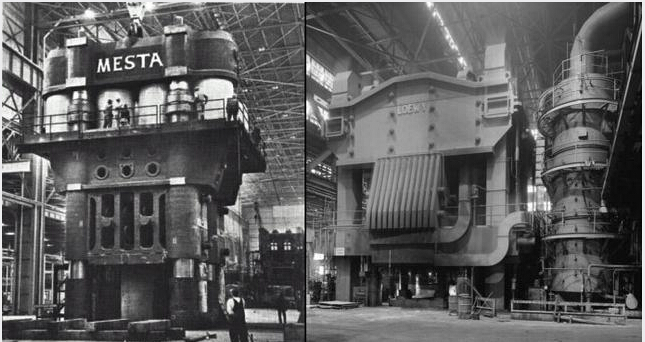 1955年,美國(guó)梅斯塔(MESTA)公司為美國(guó)鋁業(yè)公司克利夫蘭工廠制造4.5萬(wàn)噸模鍛液壓機(jī)(左),和勞威公司(LOEWY)為Wyman-Gordon公司格拉夫頓鍛造廠制造的4.5萬(wàn)噸模鍛液壓機(jī) 。